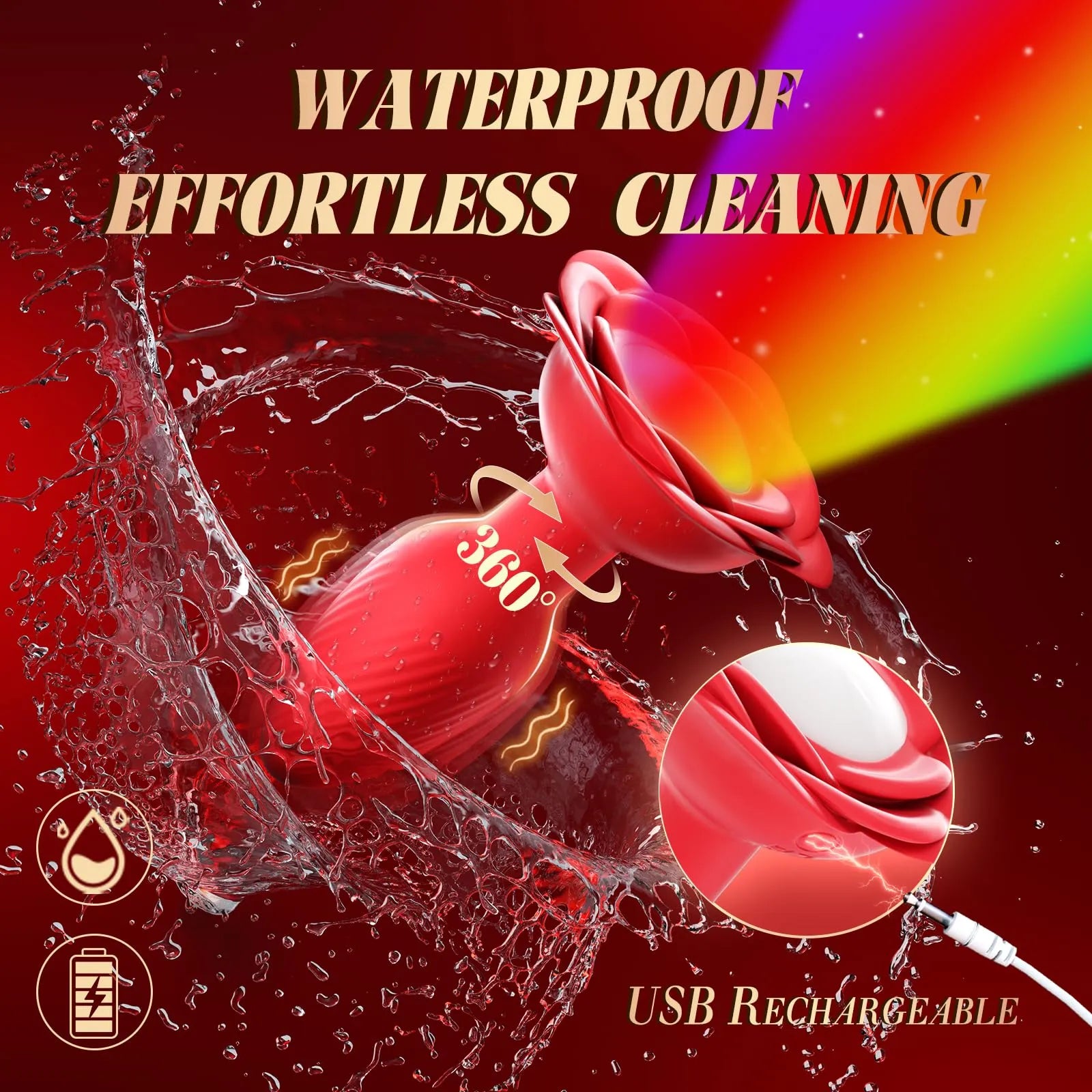 Visual and tactile stimulation - The LED lights on the rose base change rhythmically, like flowers blooming at night. Let her body dance in the light and pleasure, igniting the ultimate climax and letting her blossom into her most attractive self!